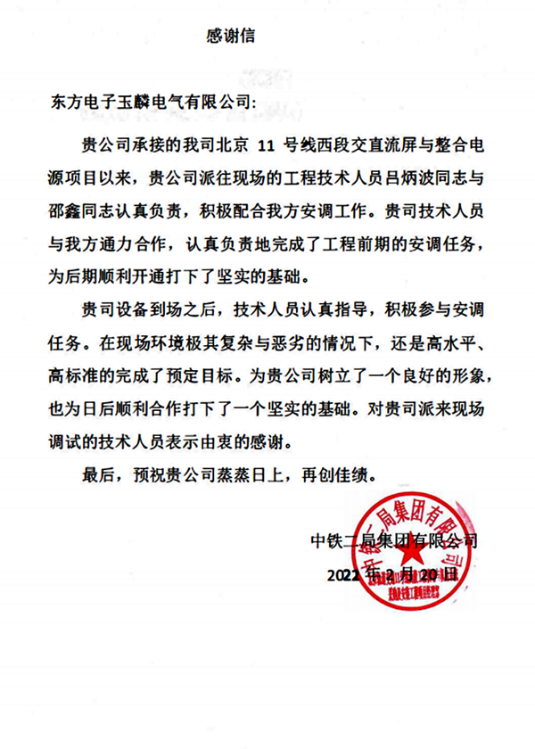 截至目前共有股份公司收到来自国网北京市电力公司、国网天津市电力分公司、国网冀北电力有限公司张家口供电公司、国网冀北廊坊供电公司的感谢信;威思顿公司收到来自国网冀北电力有限公司张家口供电公司的感谢信;国网中电公司收到来自国网冀北电力有限公司张家口供电公司的感谢信;玉麟公司收到来自中铁二局集团有限公司的感谢信。